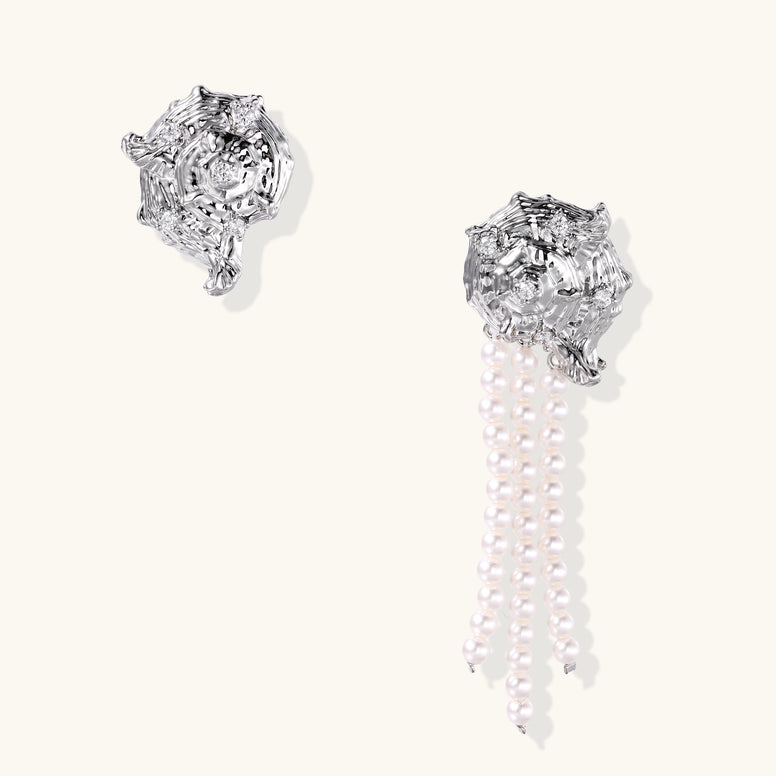 Geometric crystal formations meet lustrous pearl cascades in these architectural statement earrings that channel serious sophisticated queen energy.